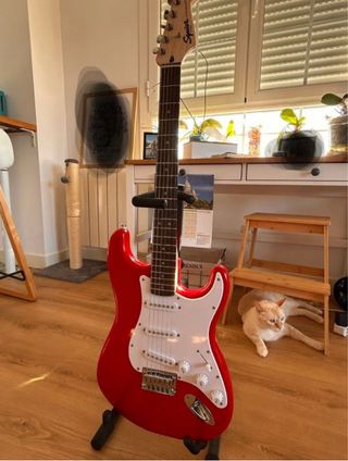 Guitarra eléctrica Squier Affinity Stratocaster en color rojo. • Cuerpo de aliso. • Mástil de arce. • Diapasón de palisandro. Incluye funda - Gato No Incluido. Totalmente nueva, tocada dos veces: cuando se probó en la tienda y otra vez en casa, desde entonces hace juego con el salón.