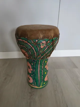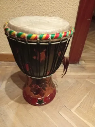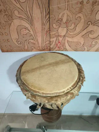 Instrumento de percusión africana. - Elaborado con madera tallada a mano. - Diseño tradicional. - Medidas aproximadas: 63 cm de alto x 32 cm de diámetro. - Parche como nuevo sin apenas uso. - 30cm de parche. - 6,2 kg