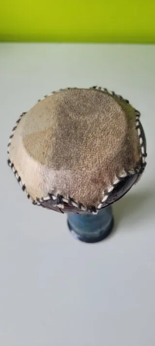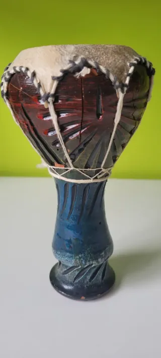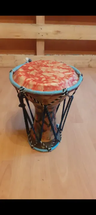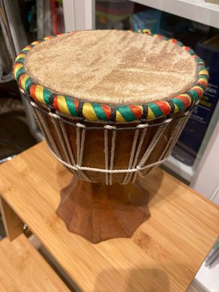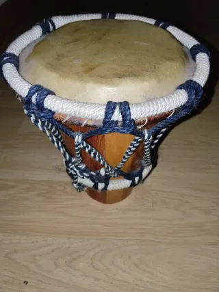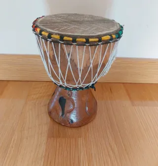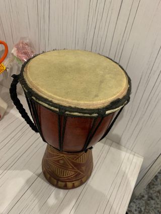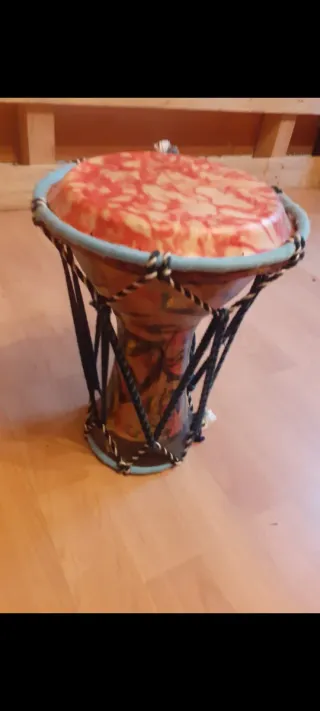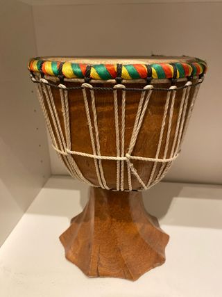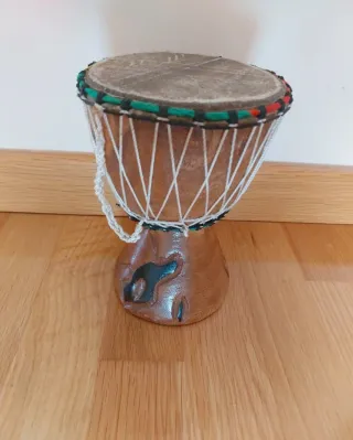 Instrumento de percusión africano tipo djembé. - Fabricado en madera. - Diseño tradicional con cuerdas y parche animal. - Base decorada con motivos. - Incluye asa de transporte. - Prácticamente nuevo, uso solo como atrezzo para fotografías.