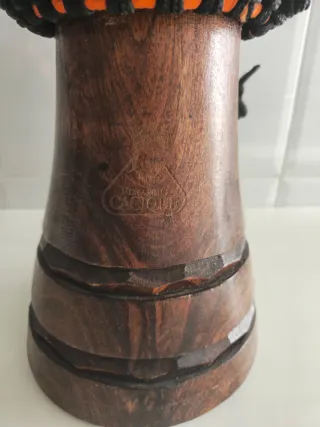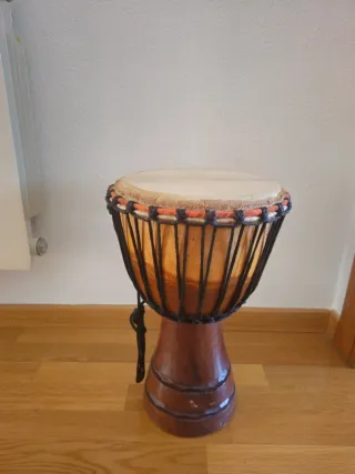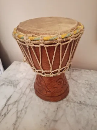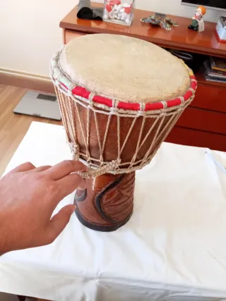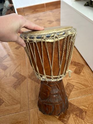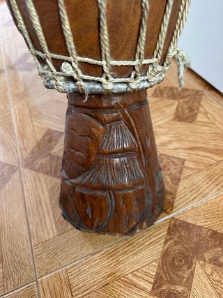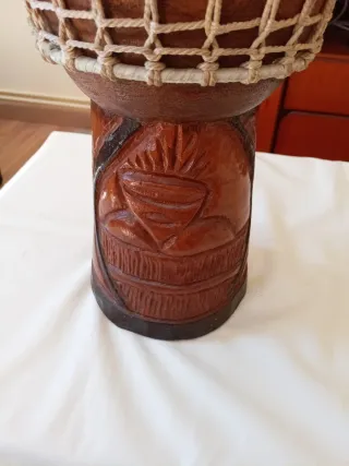vendo djembé de madera con tallado decorativo. está en buen estado, con uso normal. funciona perfectamente tanto para tocar como para usarlo de decoración. tamaño ideal para casa, fácil de mover. tiene muy buen sonido para su tamaño.
