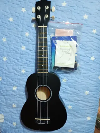 Ukelele negro, ideal para iniciarse en la música. - Cuerpo de madera. - Cuerdas de nylon. - Incluye accesorios.