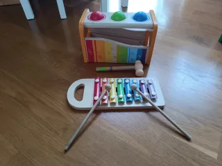 Instrumento musical de madera de la marca Hape, diseñado para niños. Incluye varios elementos para crear música. - Xilófono de 8 notas de colores. - Tambor con baquetas. - Platillo. - Rascador de madera. - Maraca