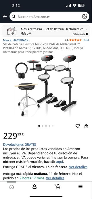 Set de Batería Eléctrica MK-0 con Pads de Malla Silent 7", Platillos de Goma 8", 12 Kits, 68 Sonidos, USB MIDI, Incluye Accesorios para Principiantes y Niños