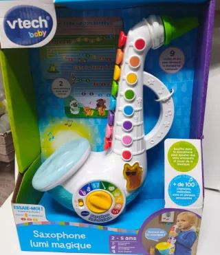 Saxofón musical Vtech Lumi Magique para niños de 2 a 5 años. Fomenta la estimulación auditiva y el desarrollo musical. - Incluye 2 tarjetas de partituras. - Más de 100 canciones, melodías y frases. - 9 modos de juego interactivos. - Sonidos y frases divertidas.
