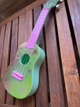 Ukelele para niños, ideal para principiantes. Es un instrumento pequeño y ligero, perfecto para manos pequeñas. - Diseño atractivo con puntos y brillos. - Color verde y rosa. - Material plástico resistente.