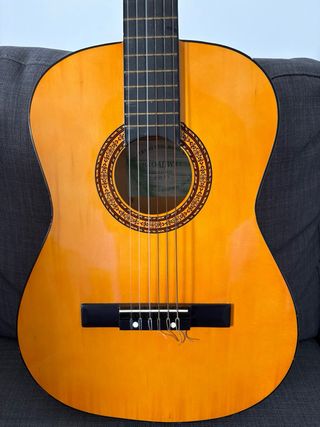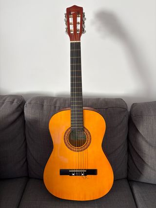 Guitarra clásica de tamaño reducido (3/4), ideal para iniciarse en la música. - Cuerpo de madera. - Seis cuerdas de nylon. - Diseño tradicional.