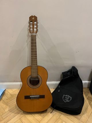 Guitarra clásica de tamaño reducido, ideal para iniciarse en la música. Incluye funda. - Color natural de la madera. - Cuerdas de nylon.