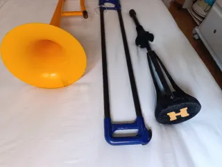 Trombón de juguete de plástico, ideal para iniciarse en la música. - Fabricado en plástico resistente. - Diseño colorido y divertido. - Incluye boquilla. 76cm * 26cm