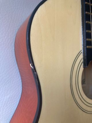 Guitarra acústica de tamaño reducido, ideal para niños. Le falta una cuerda - Cuerpo con acabado degradado en tonos naranjas y rojos. - Mástil de madera oscura con trastes. - Clavijero con afinadores blancos.