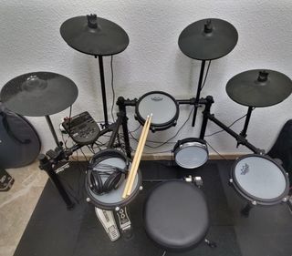 Batería electrónica Alesis Nitro Mesh mejorada con: - Bombo de malla mucho más silencioso que el de goma, tus vecinos y familiares lo agradecerán (original también incluido). - 2° crash Yamaha de 10" con soporte. Más el kit original con: - Módulo. - Rack completo. - Pedal individual. - 4 pads (solo 3 en la foto). 3 platos. - Cables. Está muy cuidada y funciona a la perfección. + pedal individual Alesis, doble pedal de las fotos no incluido. + taburete Alesis. + baquetas. + auriculares Alesis especiales para batería. + alfombra anti-impacto. Parches Remo de gran calidad. Cajas originales. Por 150€ más, caja Roland de 10".