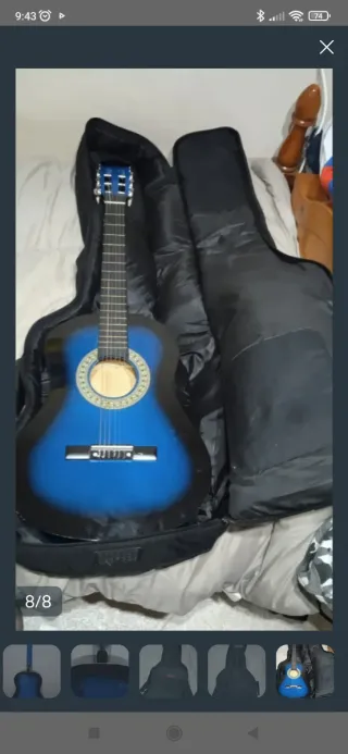 Guitarra acústica de tamaño infantil en color azul y negro. Incluye funda para su transporte. - Acabado degradado azul y negro. - Cuerdas de nylon. - Incluye funda. Con signos de desgaste y algún arañazo pero nada importante.