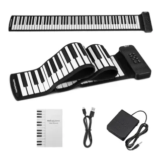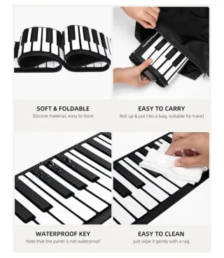 Piano enrollable POGOLAB de 88 teclas, ideal para practicar en cualquier lugar. Incluye accesorios para una experiencia completa. - Teclado flexible y portátil. - Incluye pedal de sustain. - Cable USB para alimentación y conexión. - Manual de usuario.
