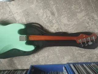 Bajo eléctrico con mástil de arce canadiense caramelizado. - Cuerpo de color menta. - Golpeador de color cobre. - Puente metálico dorado. - Pastillas negras.