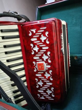 Acordeón de la marca Barcarole en color rojo. Alemana .96 bajos 5 registros en cantante y 3 cambios en bajos - Teclado de piano. - Diseño clásico con fuelles.