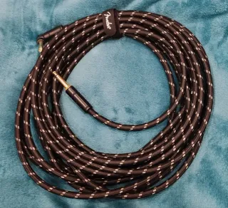 Cable para instrumentos musicales de la marca Fender. - Longitud de 7,5 metros. - Conector en ángulo en un extremo. - Color negro con detalles plateados.