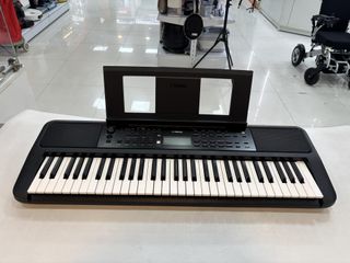Teclado musical Yamaha en buen estado, ideal para aprender. - Incluye adaptador de corriente. - Teclas blancas y negras. - Panel de control con botones y pantalla digital.