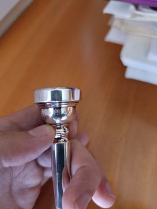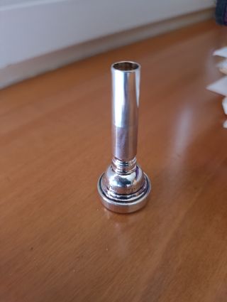 Boquilla para fliscorno Denis Wick. Diámetro de copa: 16,00mm Diámetro total: 26,59mm Anchura de aro: 5,30mm Taladro: 4,45mm Tudel americano estrecho de 9,30mm de diámetro Acabado plateado No usada, solo para pruebas de embocadura