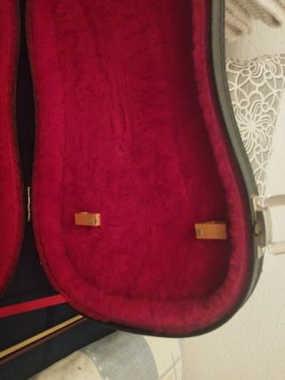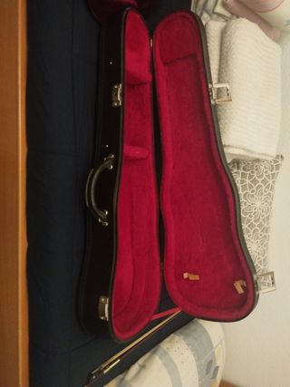 Estuche para violín de piel sintética y pelo ( bastante pelo) por dentro. Tiene 2 cierres de seguridad con sus respectivas llaves y compartimento para transportar 2 arcos. Con algunas marcas de desgaste ( ver fotos) muy rígido y resistente. El precio no es negociable.
