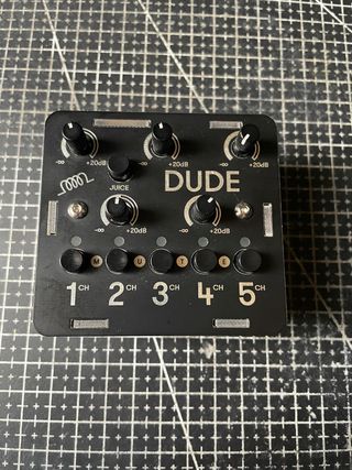 Mezclador Bastl Dude: 5 canales con +20dB de ganancia. Ideal para Pocket Operators y Volcas. Portátil, robusto y con mutes por canal. ¡Perfecto para jams DAWless!