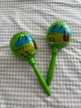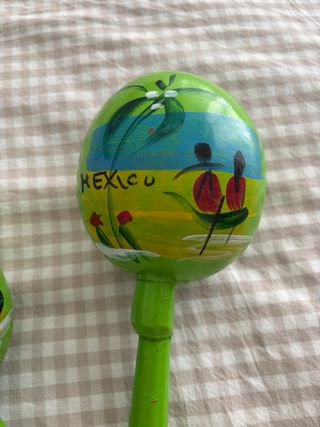 Par de maracas de madera pintadas a mano con un vibrante diseño inspirado en México. Cada maraca presenta un paisaje tropical con palmeras, el mar y figuras humanas, todo sobre un llamativo fondo verde. - Hechas de madera. - Pintura artesanal. - Diseño temático de México. - Medidas: 9 cm x 20 cm.