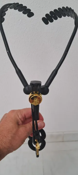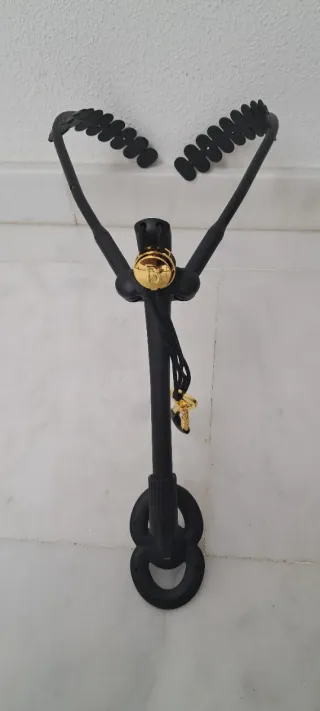 Arnés para saxofón con un diseño elegante y funcional. Cuenta con un detalle de logo dorado que le añade un toque distintivo. - Diseño en forma de Y. - Cierre ajustable. - Detalle de logo dorado. - Material negro.