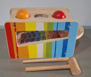 Juguete educativo de madera con diseño colorido. - Incluye xilófono con barras de colores. - Dos bolas para golpear. - Dos mazos de madera.