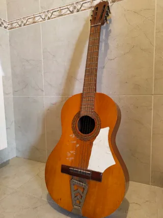 Guitarra española de la marca Ángeles. El cuerpo de la guitarra está en muy buen estado aunque con algún pequeño desperfecto, únicamente necesita una limpieza y cambio de cuerdas. Instrumento clásico hecho en la Comunidad Valenciana. - Cuerpo de madera. - Mástil de madera. - Diapasón con trastes. - Clavijero metálico.