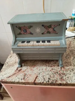 Este es un antiguo piano decorativo, ideal para coleccionistas o como pieza de exhibición. Funciona perfectamente año 30/50 - Diseño de piano. - Acabado en color azul pálido. - Detalles pintados a mano. Tiene una esquina rota como se ve en la foto nada que no se pueda arrglar