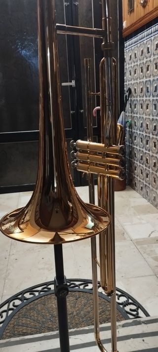 Trombón de pistones Yamaha en Sib. Un instrumento de viento metal con un acabado brillante. - Pistones. - Tonalidad Sib.