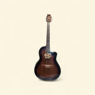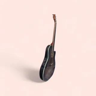 Guitarra electroacústica Ovation con un diseño distintivo. - Cuerpo con acabado brillante. - Múltiples orificios en la tapa. - Mástil de madera. - Clavijero plateado.