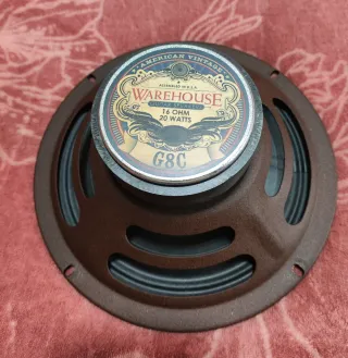 Altavoz para amplificador de guitarra marca Warehouse WGS, modelo G8C. - Tamaño 8" - Impedancia: 16 Ohm - Potencia: 20 Watts - Ensamblado en EE.UU. - American Vintage serie. Recomendado para actualizacion del Fender Champ entre otros Esta nuevo, no tiene ni 4 horas de uso y en su embalaje original. No acepto ofertas ni cambios. Gracias