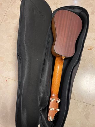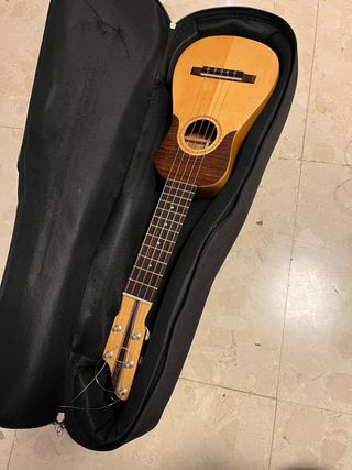 Timple canario de madera con funda. Tapa trasera de palo santo macizo y trabajo de varillaje interno. Timple convertido en guitarro, guitarrico 5 cuerdas .. diapason a nivel de tapa - luthier inicial conocido faycan - Diapasón nivel de tapa con trastes. - Incluye funda negra acolchada de gran calidad