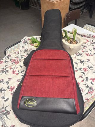Funda para guitarra marca Cibeles. Diseñada para proteger tu instrumento. - Color negro con detalles en rojo. - Compartimento frontal. - Logo de la marca en la parte inferior. La guitarra tiene desgastes del tiempo, pero suena bien y sirve perfecta para principiantes. Mirar segunda foto .