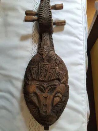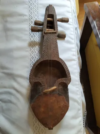 Antiguo instrumento musical de cuerda de Nepal, llamado Sarngui. Fabricado manualmente en una sola pieza de madera. Tallada con hermosas figuras. La faltan dos cuerdas y el arco. Mide 42 cm largo y ancho de la caja 12 cm. - Pieza única.