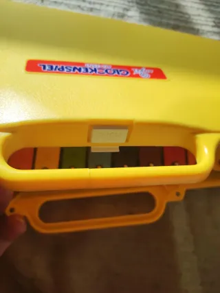 Xilófono glockenspiel de color amarillo brillante. Un instrumento musical divertido y educativo. - Diseño de plástico resistente. - Incluye asa para facilitar su transporte. - Presenta ranuras decorativas en los laterales. La abertura se ha rajado, pero está perfectamente