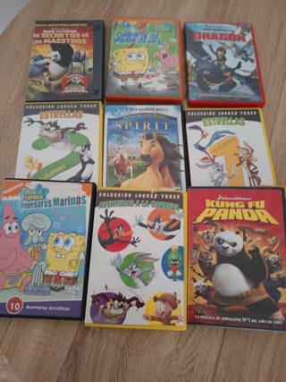 Colección de 9 películas de dibujos animados en formato DVD. - Kung Fu Panda: Los Secretos de los Maestros - Cuentos del Fondo del Mar - Cómo Entrenar a tu Dragón - Colección Looney Tunes: Estrellas Vol. 1 - Spirit: El Corcel Indomable - Bob Esponja: Travesuras Marinas Vol. 10 - Colección Looney Tunes: Aventuras a la Carrera - Kung Fu Panda