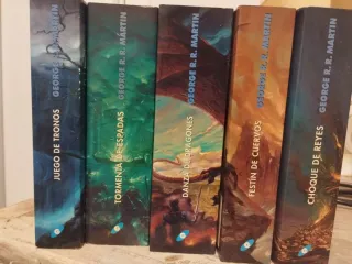 Todos los libros de Canción de Hielo y Fuego: 1. Juego de tronos (A Game of Thrones) — libro 1  2. Choque de reyes (A Clash of Kings) — libro 2  3. Tormenta de espadas (A Storm of Swords) — libro 3  4. Festín de cuervos (A Feast for Crows) — libro 4  5. Danza de dragones (A Dance with Dragons) — libro 5 En muy buen estado. No son los de bolsillo. Leídos una vez.