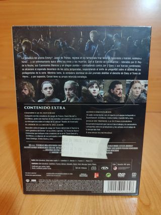 Colección completa de las temporadas 1 a 7 de Juego de Tronos en formato DVD. IDIOMAS: Español, Inglés, Francés, Alemán, Checo, Húngaro y Polaco. Subtítulos en esos idiomas y en Portugués, Rumano, Turco, Griego y Serbio. Envío posible en Canarias - Incluye las temporadas 1, 2, 3, 4, 5, 6 y 7. - Caja recopilatoria con diseño de la serie.