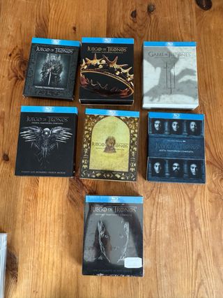 Game of thrones En castellano, oficiales y con todos los extras. Vendo por falta de espacio, solo vista una vez. Temporadas de la 1 a la 7 La 7 en BR, incluye un BR extra llamado conquista y rebelion La 6, en Bluray, tiene portada lenticular La 5 en Bluray La 4 en Bluray incluye un libro de ilustraciones La tercera en BR La primera y segunda en pack DVD Todas en perfecto estado, sin desperfectos y funcionando