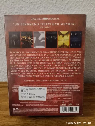Colección Juego de Tronos Blu-Ray. No se vende por separado. - Temporada 1, 2, 3 Blu-Ray (Edición Digipack). - Temporada 4 Blu-Ray (Edición Premium), incluye "Beautiful Death", el Libro de la Bella Muerte. - Temporada 5, Blu-Ray (Edición estándar) precintada, no se ha abierto. - Temporada 6 Blu-Ray (Edición Premium). - Temporada 7, Blu-Ray (Edición estándar). 🔴¿Necesitas consultar algo? Pregunta sin compromiso. 🔴¿Quieres comprar más de un objeto del perfil? Comunícamelo y lo arreglamos.