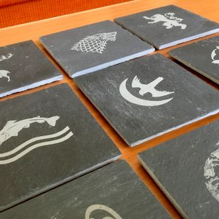 Nuevos, nunca usados. Pack de 9 posavasos de piedra de pizarra natural, grabados con los emblemas de las casas de la serie Juego de Tronos. Ideal para coleccionistas o como regalo. Incluye protectores de goma en la base para prevenir rayones y deslizamientos. Cada posavasos mide 10 x 10 cm.