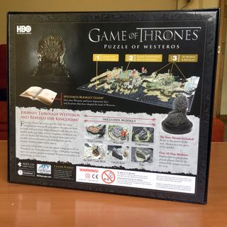 Nuevo y sin montar: Hermoso puzle 4D Cityscape de tres capas del mapa de Poniente (Westeros) de Juego de Tronos con 1400 piezas, que incluye castillos en 3D, el Trono de Hierro y un librito con la historia de los castillos de Poniente. Perfecto para coleccionistas o como regalo. Las medidas del puzle montado son 76 x 46 x 5 cm.