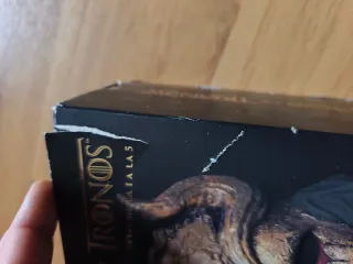 Juego de Tronos "Canción de Hielo y Fuego" Tapa dura La sobrecubierta tiene leves rotos, de estar en una estantería y estropearse en un traslado. Las cubiertas, de tapa dura, y todo el interior está en perfecto estado. No se ha leído, por lo que el lomo está intacto. Evidentemente, sin marcas, páginas escritas o esquinas dobladas.