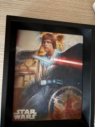 Cuadro decorativo con diseño holográfico de Star Wars. Presenta una imagen dinámica de Luke Skywalker con su sable de luz y Darth Vader con su sable de luz. - Diseño holográfico. - Personaje: Luke Skywalker y Darth Vader - Temática: Star Wars.