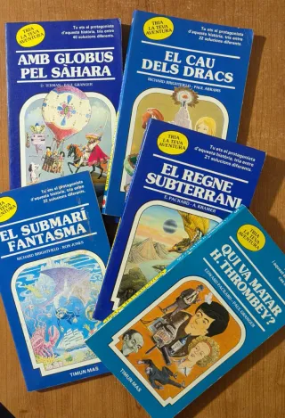 Pack de 5 llibres de la col•lecció Tria la teva aventura. n°5 QUI VA MATAR H. THROMBEY? n°8 EL REGNE SUBTERRANI n°19 EL SUBMARÍ FANTASMA n°20 EL CAU DELS DRACS n°27 AMB GLOBUS PEL SÀHARA Editorial Timun Mas. Llibres amb signes d'ús i del pas del temps.