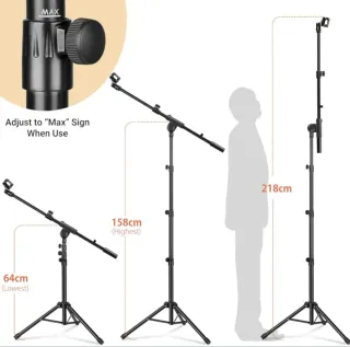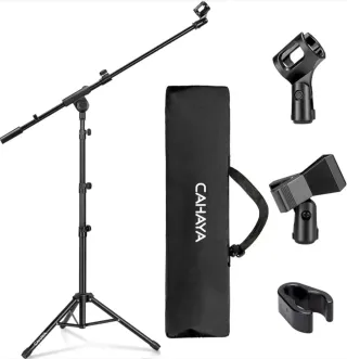 Trípode negro para micrófono, ideal para ajustar la posición de tu equipo de audio. Incluye bolsa de transporte. - Soporte de micrófono ajustable. - Base de trípode estable. - Bolsa de tela negra con logo CAHAYA. - Se pliega todo ocupa muy poco.