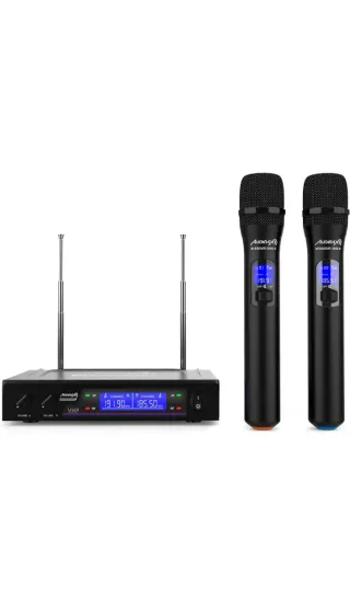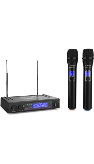 Set de dos micrófonos inalámbricos VHF con receptor. Nuevo en su caja sin uso - Diseño en color negro. - Pantalla digital en cada micrófono. - Antenas retráctiles en el receptor.