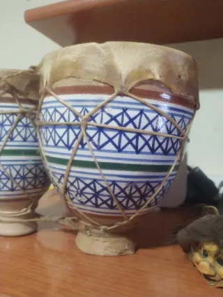 Par de tambores timbales de estilo africano, con un diseño decorativo. - Cuerpo de cerámica con franjas verdes y azules. - Decoración geométrica en azul. - Piel natural en la parte superior. - Cuerdas de sujeción.