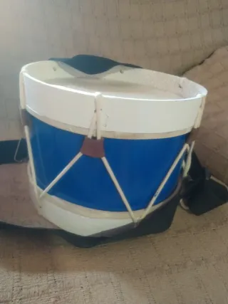 Tambor artesanal con un diseño llamativo. - Cuerpo principal de color azul y blanco. - Correa negra para facilitar su transporte. - Cuerdas blancas de sujeción.