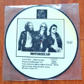 Disco de vinilo Picture Disc del grupo Motorhead. - Diseño icónico de la banda. - Formato Picture Disc. -Canciones:Leavin´here/White line fever. -Edición de Munster Records 2001.